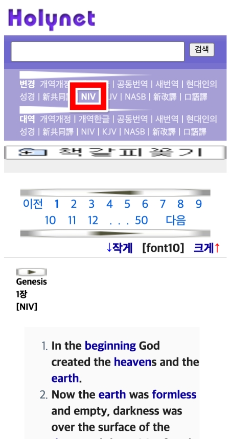 5. 한글 번역본뿐만 아니라 외국어 성경도 쉽게 볼 수 있습니다. 메뉴에서 'NIV'와 같은 영어 성경을 고르면, 해당 구절이 영어로 어떻게 표현되는지 바로 확인할 수 있어 어학 공부나 원문 비교에 큰 도움이 됩니다.