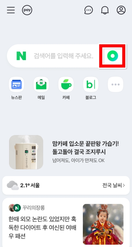 4. 네이버(NAVER) 어플에서도 비슷한 기능을 찾을 수 있습니다. 네이버 어플 메인 화면 검색창 오른쪽에 보이는 동그란 녹색 아이콘을 눌러주세요.