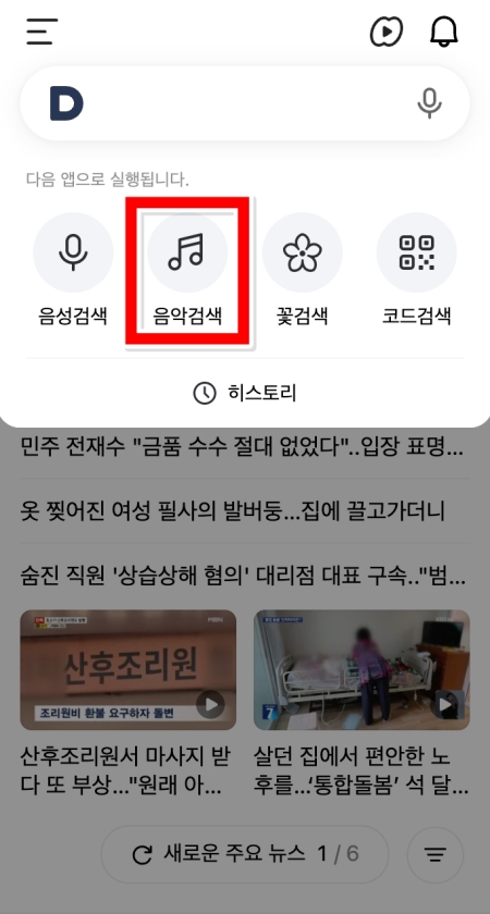 2. 이제는 다음(Daum) 어플을 활용해 보세요. 어플을 열고 검색창 오른쪽에 있는 마이크 모양의 아이콘을 누르면 여러 가지 검색 방식이 나타납니다.