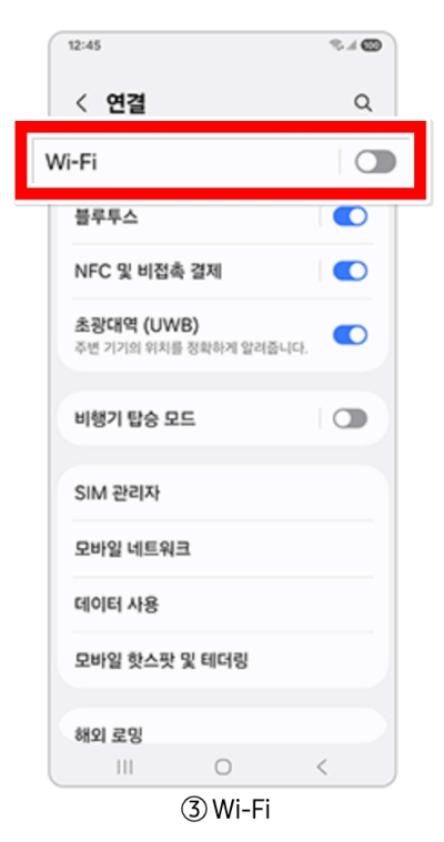 3. '연결' 메뉴로 이동하면 제일 위에 'Wi-Fi' 항목이 있습니다. 오른쪽에 있는 스위치 대신 글자 부분을 직접 눌러 와이파이 목록이 있는 상세 화면으로 넘어가 주세요.