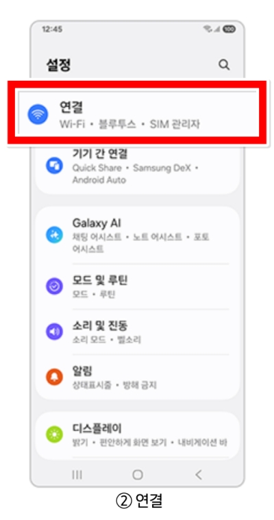 2. 설정 메뉴에 들어오면 가장 위쪽에 '연결'이라는 항목이 보일 거예요. 와이파이나 블루투스 등 통신과 관련된 모든 기능은 이곳에서 설정할 수 있습니다.