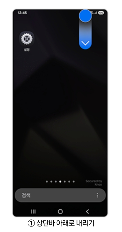 7. 더 간편한 방법도 있습니다. 스마트폰 화면의 가장 윗부분을 손가락으로 쓸어내리면, 자주 사용하는 기능들을 모아놓은 빠른 설정창이 나타납니다.