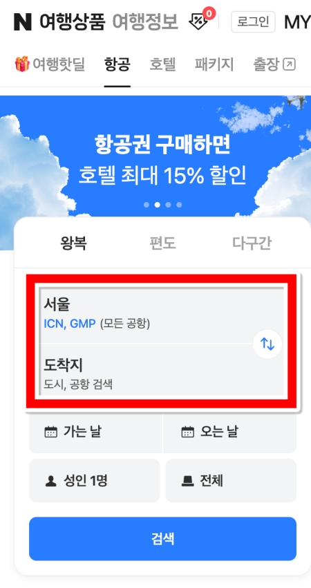 5. 가는 날과 오는 날, 그리고 인원수와 좌석 등급까지 모두 정했다면, 파란색 '검색'을 눌러 조건에 맞는 항공편을 찾아봅니다. 이제 거의 모든 준비가 끝났습니다.