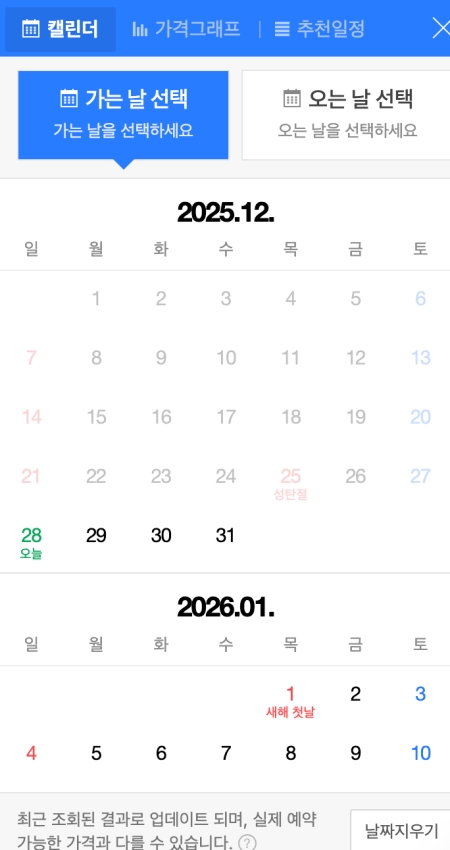 4. 달력이 나타나면 출발할 날짜를 먼저 선택합니다. 2025년 12월과 2026년 1월의 달력이 보이며, 이 중에서 원하는 날짜를 고를 수 있습니다. 오늘 날짜와 공휴일도 표시되어 있어 일정을 짜기 편리합니다.