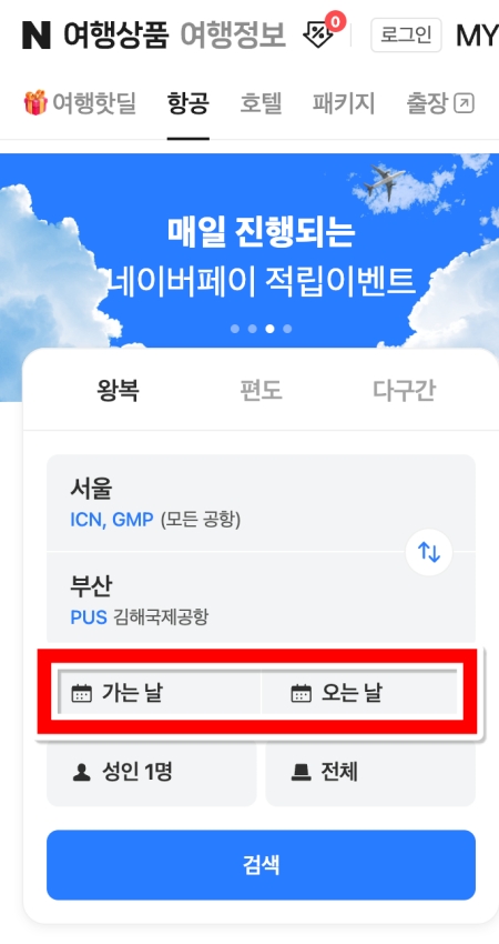 3. 출발지와 도착지 선택을 마쳤다면, 이제 여행 날짜를 정할 차례입니다. '가는 날'과 '오는 날' 부분을 눌러 달력에서 원하는 날짜를 선택하여 여행 기간을 설정해 주세요.