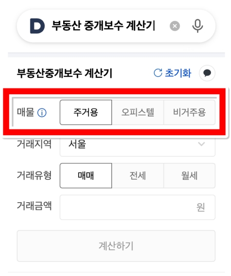 1. 계산기를 이용하는 첫 단계는 거래하려는 매물의 종류를 선택하는 것입니다. 주거용(아파트, 빌라), 오피스텔, 비주거용(상가, 토지) 중 해당하는 항목을 정확히 선택해야 합니다. 종류에 따라 적용되는 요율이 다르기 때문입니다.