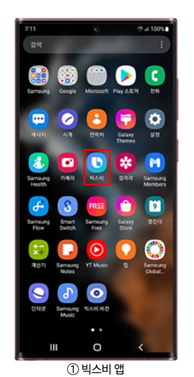 6. 이번에는 다시 빅스비 기능을 켜는 방법입니다. 비활성화했던 빅스비 호출 기능을 다시 사용하고 싶다면, 먼저 스마트폰의 앱 서랍에서 '빅스비' 앱을 실행해주세요.