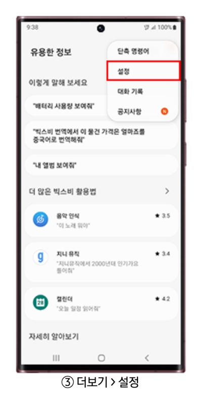 3. '유용한 정보' 화면이 나타나면, 오른쪽 위 점 세 개 모양의 '더보기'를 누른 후 나타나는 메뉴에서 '설정' 항목으로 들어가 주세요. 이곳에서 빅스비와 관련된 전반적인 내용을 변경할 수 있습니다.