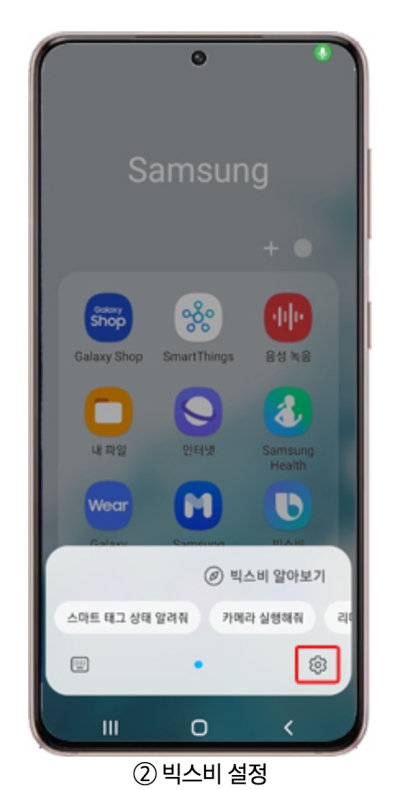 7. 빅스비가 활성화된 후 하단에 나타나는 메뉴에서 톱니바퀴 모양의 설정 아이콘을 누르면 빅스비 설정 화면으로 바로 이동할 수 있어 편리합니다.