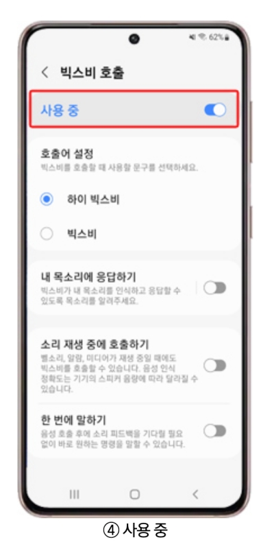 9. '빅스비 호출' 화면의 제일 위에 있는 '사용 중' 항목의 스위치를 눌러 활성화하면, "하이 빅스비"라는 음성 명령으로 언제든지 빅스비를 호출할 수 있도록 기능이 다시 켜집니다.