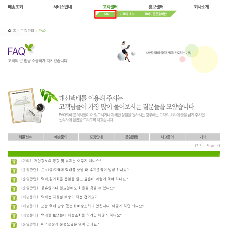 6. 그 외에 궁금한 점이 있다면 상단 '고객센터'의 'FAQ' 항목을 살펴보는 것도 좋은 방법입니다. 이곳에는 화물 접수, 배송 문의, 운임 관련 등 고객들이 자주 묻는 질문과 답변이 잘 정리되어 있어 많은 궁금증을 빠르게 해결할 수 있습니다.