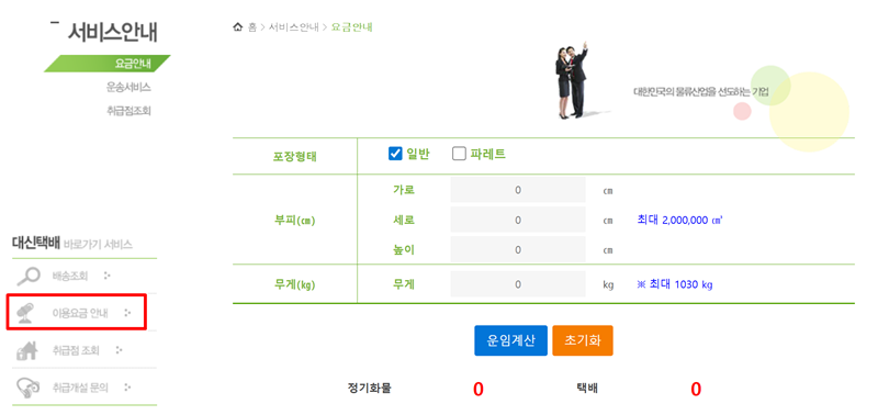5. 지점 위치 외에 예상 요금이 궁금하다면, 왼쪽 메뉴의 '이용요금 안내'를 통해 미리 계산해볼 수 있습니다. 보내려는 물품의 가로, 세로, 높이와 무게를 입력하면 예상 운임을 확인할 수 있어 미리 경비를 계획하는 데 도움이 됩니다.