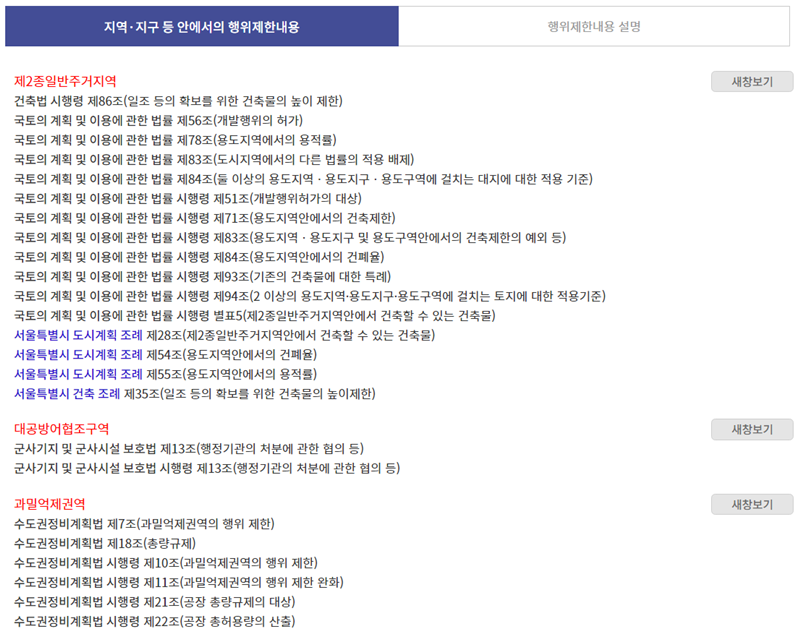 5. 다시 토지이용계획 확인서 화면으로 돌아와 아래로 내려가면 '지역·지구 등 안에서의 행위제한내용'을 볼 수 있습니다. 이곳에서는 제2종일반주거지역, 대공방어협조구역 등 지정된 용도에 따른 건축 제한 사항을 법령에 근거하여 안내합니다.