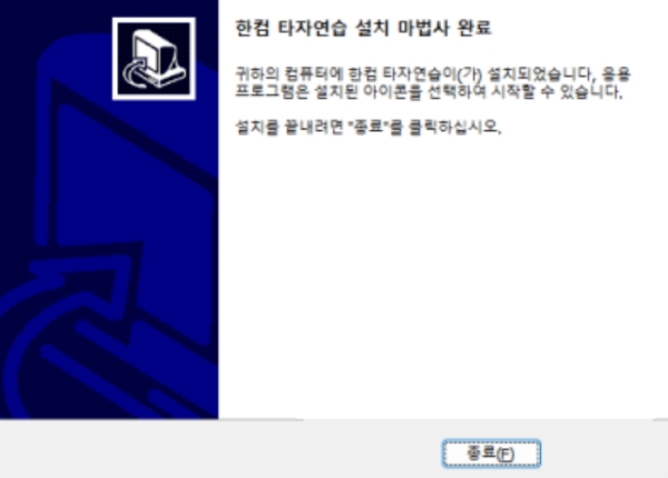 몇 가지 단계를 거치고 나면 드디어 컴퓨터에 한컴 타자연습이 성공적으로 설치되었다는 완료 창이 나타나요. 이제 바탕화면에 생성된 아이콘을 통해 언제든지 프로그램을 실행할 수 있게 되었어요. 설치를 마무리하기 위해 화면 아래에 있는 '종료' 부분을 눌러 설치 마법사를 닫아주면 됩니다.