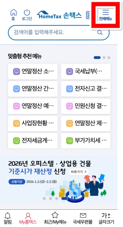 세금 관련 업무는 이름만 들어도 괜히 어렵게 느껴지죠. 먼저 스마트폰 인터넷으로 '손택스' 모바일 홈페이지에 접속해보세요. 첫 화면에서 바로 계산기를 찾기 어려우니, 화면 오른쪽 위에 있는 석 삼(三) 모양의 '전체메뉴'를 눌러 모든 기능을 펼쳐보는 것이 좋아요.