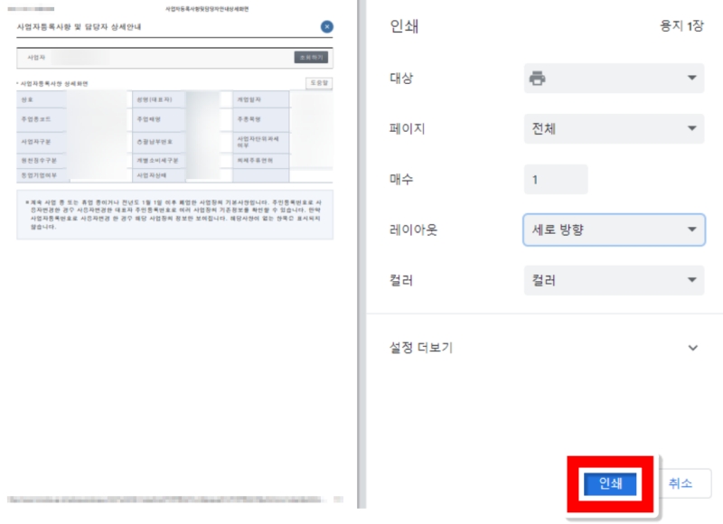 마지막으로 인쇄 미리보기 화면이 나타납니다. 여기서 용지 방향이나 다른 설정을 조정한 뒤, 오른쪽 아래에 있는 파란색 '인쇄' 부분을 눌러주면 발급 과정이 모두 끝나요. 프린터로 바로 출력하거나 파일로 저장할 수 있어서 편리했어요.