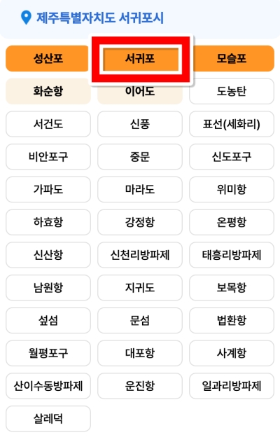 제주도 전체 중에서도 용머리해안은 서귀포시에 위치해 있어요. 따라서 지역을 좀 더 상세하게 선택해야 정확한 정보를 얻을 수 있겠죠. 여러 지역 이름 중에서 우리가 가려는 곳과 가장 가까운 '서귀포'를 선택하면 해당 지역의 상세 물때표를 볼 수 있답니다.