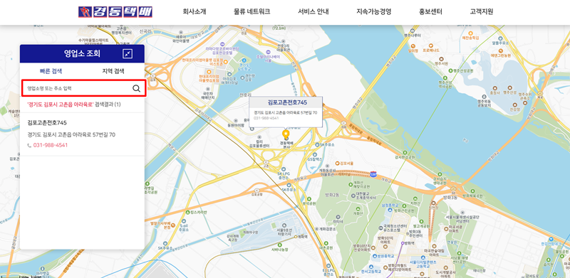3. 영업소 조회 페이지로 이동하면, 지점명이나 주소를 직접 입력하여 빠르게 검색할 수 있는 공간이 있습니다. 예를 들어 '김포시 고촌읍'과 같이 특정 지역명을 입력하면, 해당 지역에 위치한 '김포고촌전호745' 지점의 정확한 주소와 연락처가 지도와 함께 나타나 편리하게 확인할 수 있습니다.
