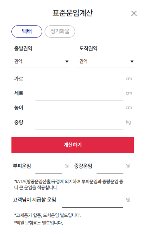 8. 더 정확한 비용 계산을 원한다면 '표준운임계산' 기능을 활용할 수 있습니다. 출발지와 도착지 권역을 선택하고, 보낼 물품의 가로, 세로, 높이와 총중량을 입력한 후 계산하면, 부피와 무게를 기준으로 산정된 예상 운임을 미리 확인할 수 있습니다.
