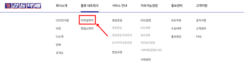 5. 일반적인 영업소보다 규모가 더 큰 물류 거점인 터미널의 위치가 궁금하다면, 다시 '물류 네트워크' 메뉴로 돌아가 이번에는 '터미널위치'를 선택합니다. 이를 통해 전국 주요 권역에 자리한 핵심 물류 시설의 정보를 별도로 확인할 수 있습니다.