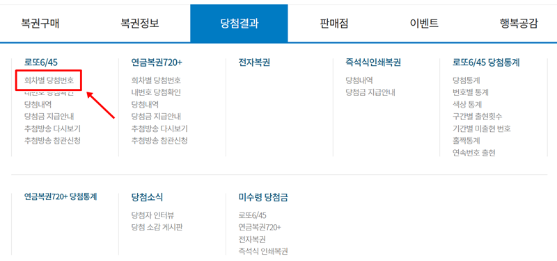 2. '당첨결과' 메뉴 아래를 보면 로또 6/45 항목에 '회차별 당첨번호'라는 세부 메뉴가 있습니다. 이곳으로 들어가면 단순히 최신 회차뿐만 아니라, 내가 원하는 과거 회차의 당첨 결과까지 모두 찾아볼 수 있습니다.