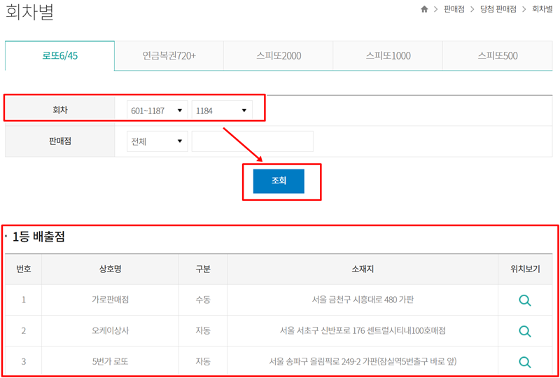6. 당첨 번호 정보와 함께 '당첨판매점 조회' 기능을 이용하면 해당 회차의 1등 또는 2등 당첨자가 어느 판매점에서 나왔는지도 확인할 수 있습니다. 어떤 지역에서 행운이 탄생했는지 궁금할 때 유용하게 쓰일 수 있습니다.