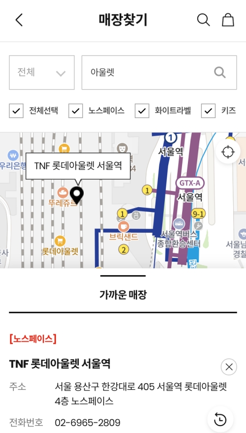 목록에서 마음에 드는 매장을 하나 선택하면, 이렇게 더 상세한 정보를 볼 수 있어요. 예를 들어 'TNF 롯데아울렛 서울역' 점을 고르면, 정확한 주소와 매장 전화번호까지 확인이 가능해요. 방문하기 전에 미리 전화를 걸어서 원하는 상품의 재고가 있는지 물어보면 헛걸음할 확률을 더 줄일 수 있겠죠.