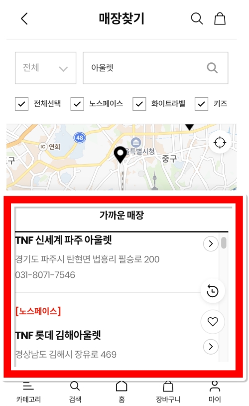 '아울렛'으로 검색하면, 그 결과가 지도 아래 목록으로 나타나요. 'TNF 신세계 파주 아울렛'이나 'TNF 롯데 김해아울렛'처럼 전국 각지에 있는 아울렛 매장들의 이름과 주소가 정리되어 나와요. 이제 내가 사는 곳에서 가깝거나, 방문할 계획이 있는 지역의 아울렛이 어디인지 한눈에 파악할 수 있게 되는 거죠.