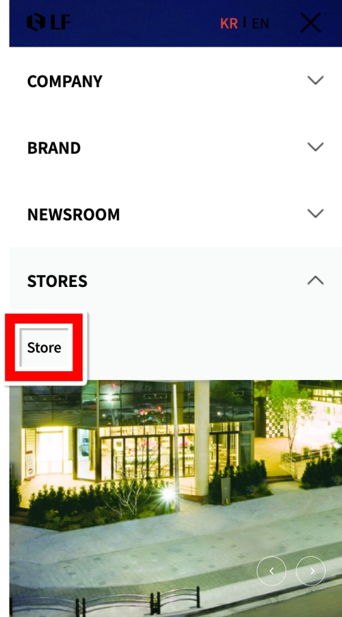 전체 메뉴로 들어가면 'COMPANY', 'BRAND' 등 여러 항목이 보일 거예요. 우리는 매장 위치를 찾는 게 목적이니, 아래쪽에 있는 'STORES' 항목을 찾아서 선택해 주세요. 그러면 그 아래에 'Store'라는 작은 메뉴가 나타나는데, 이걸 한 번 더 선택해서 들어가시면 드디어 매장 검색 페이지로 이동할 수 있습니다.