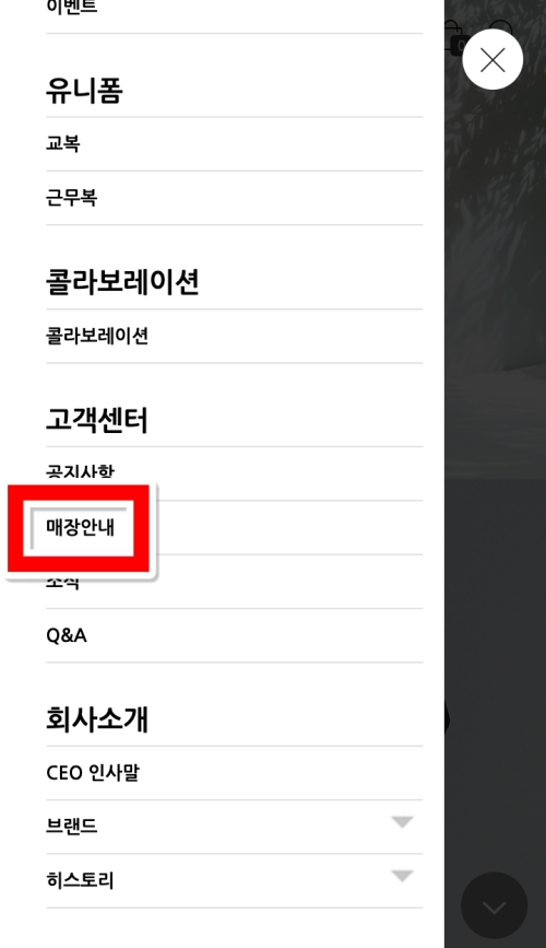 스크롤을 내리다 보면 '고객센터'라는 항목을 찾을 수 있어요. 바로 그 아래에 우리가 찾던 '매장안내' 메뉴가 있답니다. 온라인 쇼핑몰이지만 오프라인 매장 정보도 이렇게 친절하게 안내해주고 있으니 정말 편리하죠. 이 '매장안내' 부분을 선택해서 다음 화면으로 넘어가 주세요.