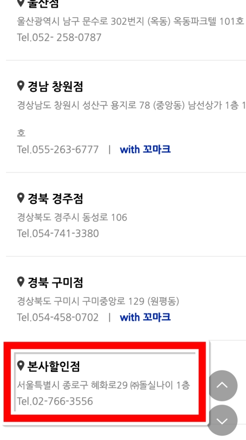 전체 매장 목록을 그냥 지나치지 마시고, 스크롤을 가장 아래쪽까지 내려보세요. 그러면 목록의 맨 마지막 부분에서 드디어 '본사할인점'이라는 이름의 매장을 발견할 수 있을 거예요. 바로 여기가 우리가 찾던 상설 할인 매장이랍니다. 주소와 연락처도 함께 적혀있으니 꼭 확인해 주세요.
