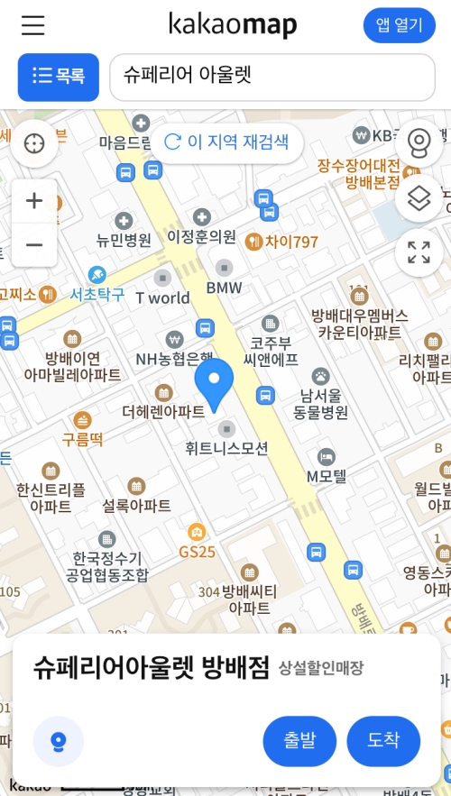 검색을 마치자마자 전국에 있는 '슈페리어아울렛' 매장 목록이 쭉 나타났어요. 서울에 있는 방배점부터 가산동에 있는 지점까지, 제가 생각했던 것보다 훨씬 많은 매장이 있어서 놀랐어요. 각 항목에는 주소와 매장 종류 같은 기본 정보가 함께 표시돼요.