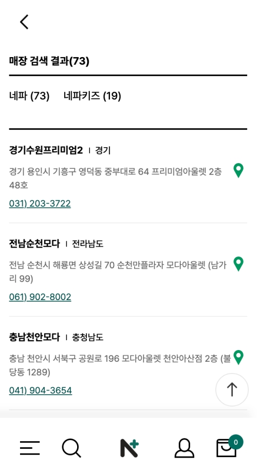 검색 결과가 나오면 '네파'와 '네파키즈'로 나뉘어 전국의 아울렛 매장 수가 표시되고, 그 아래로 매장 목록이 쭉 나타나요. 경기도 수원, 전라남도 순천 등 각 지역에 있는 매장들의 이름과 주소를 한눈에 확인할 수 있어요. 생각보다 지점이 많아서 놀랐네요.