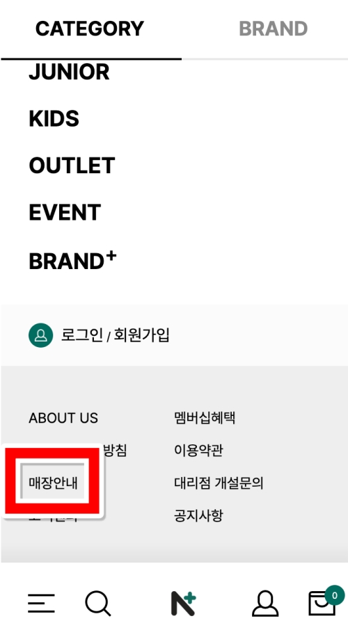 메뉴 화면으로 들어가면 카테고리별 상품 목록 아래쪽으로 시선을 옮겨보세요. 그럼 'ABOUT US'라는 항목 아래에 '매장안내'라는 글씨가 보일 거예요. 전국의 네파 매장 정보를 확인하려면 이쪽으로 들어가시면 됩니다.