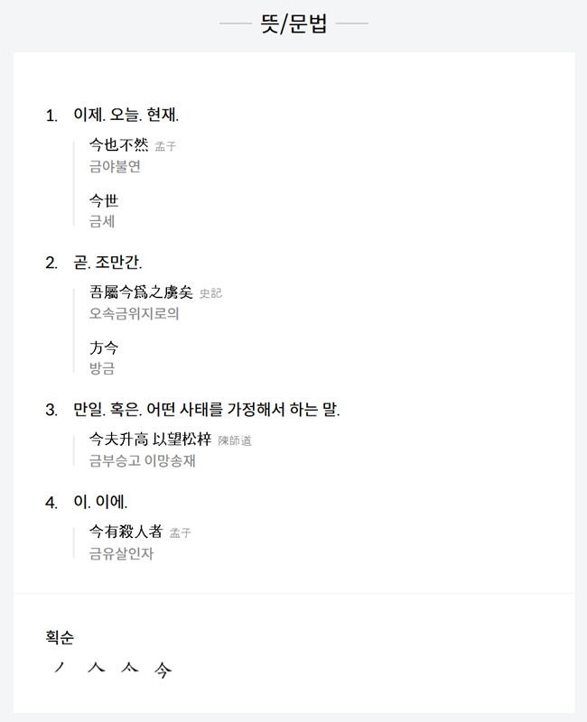 6. '이제 금(今)' 자가 가진 여러 가지 뜻과 문법적인 쓰임새를 자세히 보여줍니다. '이제, 오늘, 현재'라는 뜻 외에도 '곧, 조만간', '만일, 혹은', '이에'와 같이 다양한 의미로 사용되는 것을 예문과 함께 설명하고 있어 한자의 깊이 있는 이해를 돕습니다.