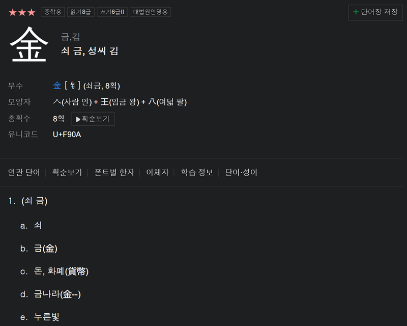 10. '쇠 금, 성씨 김(金)' 한자에 대한 상세 정보입니다. 이 한자는 부수가 제부수이며 총 8획으로 이루어져 있습니다. '쇠', '금', '돈', '금나라' 등 다양한 뜻을 가지고 있으며, 유니코드와 같은 전문적인 정보도 함께 확인할 수 있습니다.