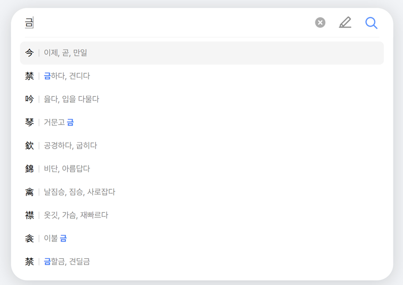 2. 검색창에 '금'이라는 글자를 입력하면, 입력창 아래로 해당 음을 가진 다양한 한자들이 나타납니다. 예를 들어 '이제 금', '금할 금', '아름다울 금' 등 여러 한자가 제시되며, 각 한자 옆에는 대표적인 뜻이 함께 표시되어 있어 원하는 한자를 찾는 데 도움을 줍니다.