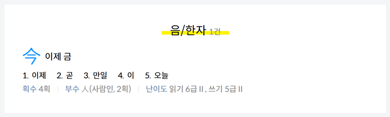 3. '금'으로 검색했을 때의 결과 화면입니다. '음/한자' 부분에 '이제 금(今)' 한 글자가 검색된 것을 볼 수 있습니다. 해당 한자의 대표적인 뜻인 '이제', '곧', '만일' 등이 나열되어 있으며, 획수와 부수, 그리고 난이도와 같은 기본적인 정보가 간략하게 요약되어 나타납니다.