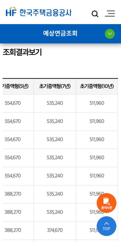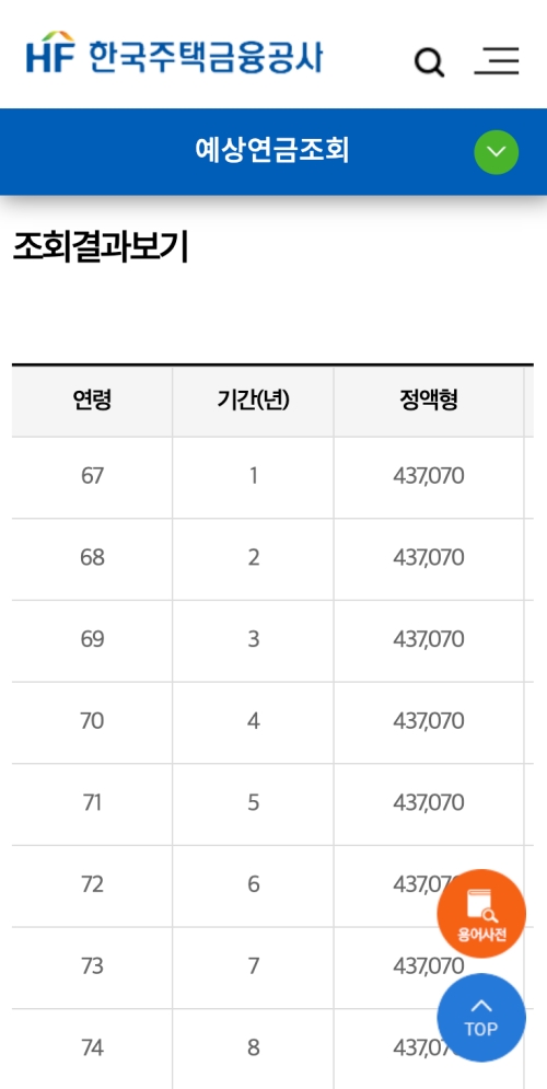그러면 내가 선택한 조건에 따라 매달 얼마를 받을 수 있는지 연령별로 정리된 표가 화면에 나타나요. 60대부터 70대 이후까지 기간에 따라 정해진 금액이 표로 정리되어 있어서 한눈에 파악하기 정말 좋더라고요. 저는 이 표를 보면서 앞으로의 지출 계획을 어떻게 세워야 할지 구체적으로 상상해 볼 수 있어서 아주 유익한 시간이었답니다.