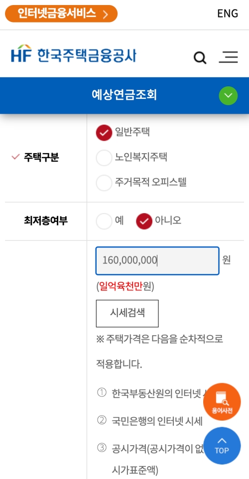 다음으로 내가 살고 있는 집이 어떤 종류인지 고르고 현재 주택 가격을 적어 넣는 단계예요. 시세 검색을 통해 내 집의 현재 가치를 파악할 수 있는데 저는 공시가격이 아닌 실제 거래되는 가격을 기준으로 넣어봤어요. 금액 단위가 크다 보니 '0' 하나만 더 붙여도 결과가 확 달라지기 때문에 조심히 입력하세요. 바로 아래에 한글로 금액을 알려줘서 엄청 헷갈리지는 않을실거에요.