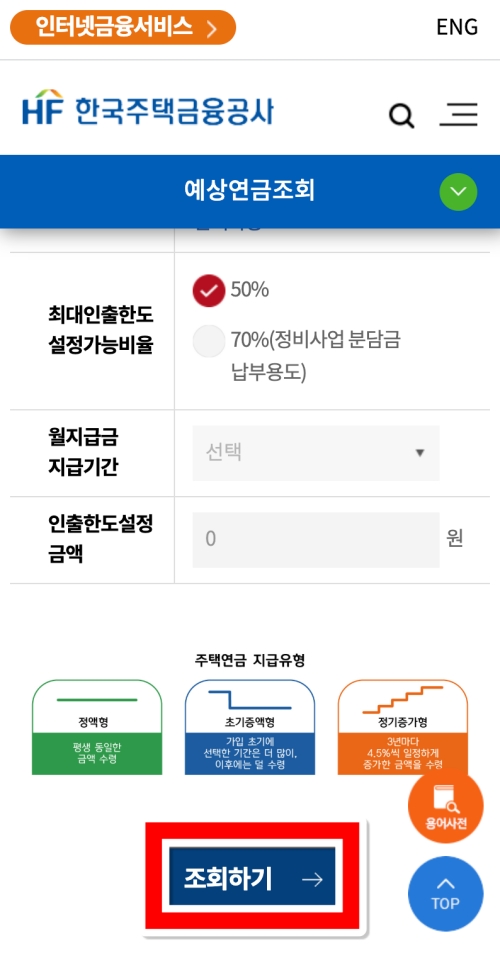이제 마지막으로 연금을 얼마나 받을 수 있는지 최종 결과를 보기 위해 화면 가장 아래에 있는 조회하기 버튼을 선택하세요. 이 버튼을 누르기 전까지는 혹시 결과가 너무 적게 나오면 어쩌나 걱정했는데 막상 누르고 나니 속이 다 시원하더라고요. 모든 항목을 다 채웠는지 마지막으로 한 번 더 확인하고 나서 결과 화면으로 이동하시면 모든 과정이 마무리됩니다.