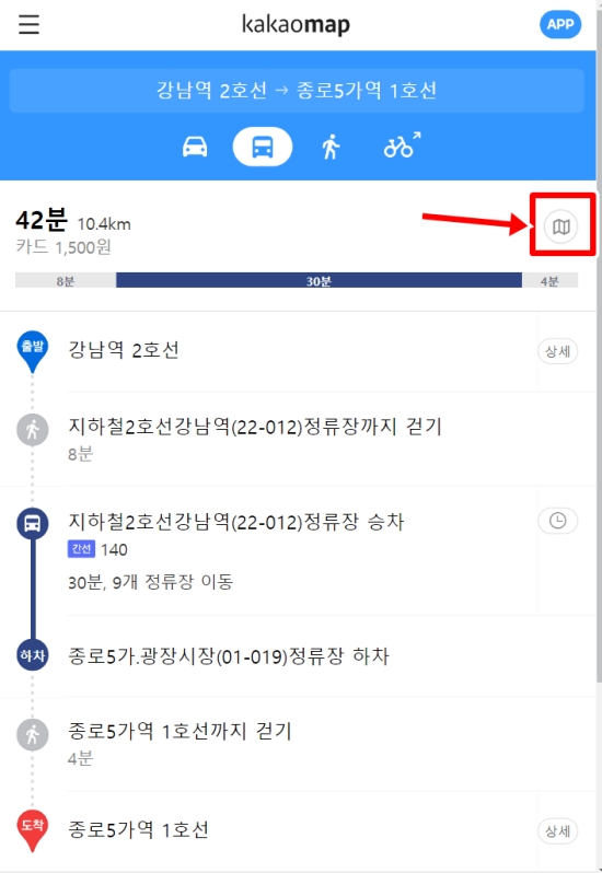 7. 전체적인 이동 경로를 지도를 통해 한눈에 보고 싶다면, 오른쪽 위에 있는 지도 모양의 아이콘을 선택해 주세요. 출발지부터 도착지까지의 전체 동선이 지도 위에 그려져 시각적으로 경로를 파악하기에 편리합니다.
