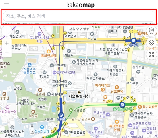 1. 카카오맵 홈페이지에 접속한 다음 가장 먼저 해야 할 일은 가고자 하는 목적지를 찾는 것입니다. 지도 화면 위쪽에 보이는 검색창에 찾고 싶은 장소의 이름이나 주소를 정확하게 입력해 주세요.