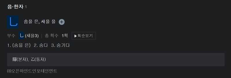 5. 검색 결과 화면에서는 선택한 한자의 음과 뜻을 가장 먼저 확인할 수 있습니다. '숨을 은, 새을 을'처럼 여러 음과 뜻을 가진 경우 모두 보여주며, 부수, 총 획수, 그리고 각 뜻에 대한 자세한 설명까지 한눈에 파악할 수 있도록 정리되어 있습니다.