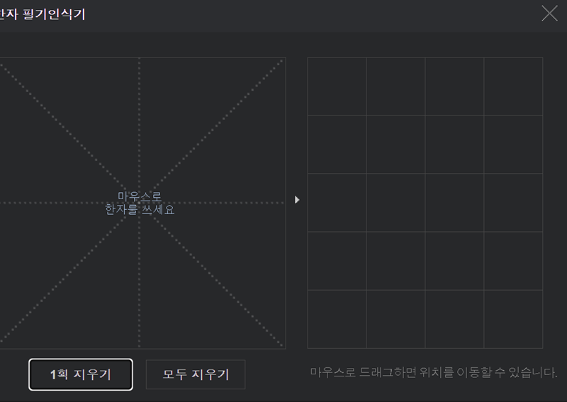 2. 필기인식기를 열면 한자를 쓸 수 있는 입력창이 나타납니다. 왼쪽의 넓은 칸에 마우스를 이용해 찾고 싶은 한자의 모양을 따라 그리면 됩니다. 쓰는 과정에 따라 오른쪽의 작은 칸들에 비슷한 모양의 한자들이 후보로 나타나기 시작합니다.