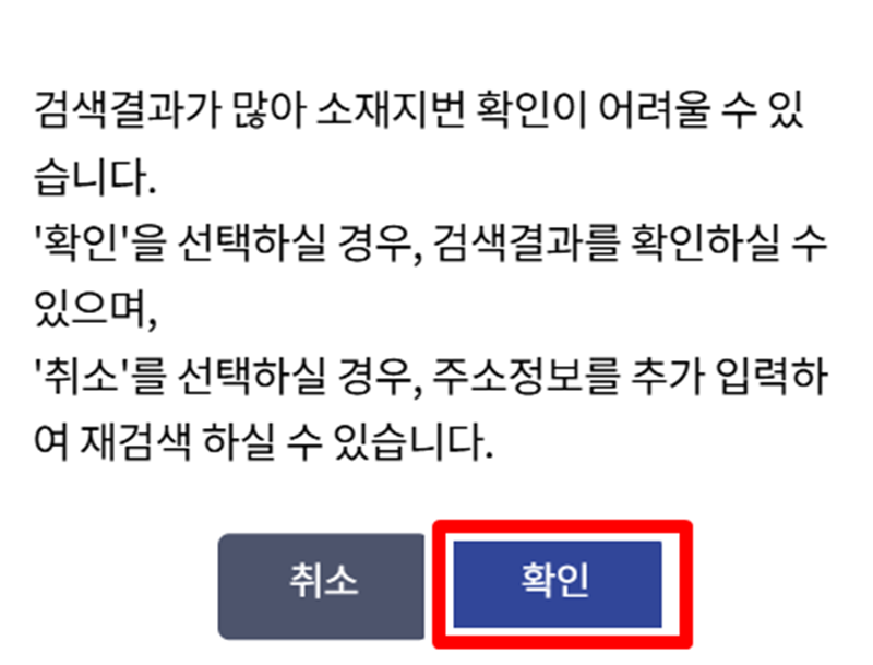 7. 주소를 검색했을 때 같은 위치에 여러 부동산이 등록된 경우, 검색 결과가 많아 소재지번 확인이 어려울 수 있다는 안내창이 나타날 수 있습니다. 이때 당황하지 말고 '확인'을 눌러 검색된 전체 목록을 보고 내가 원하는 부동산을 정확하게 선택하는 단계를 진행하면 됩니다.