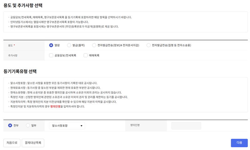 9. 다음은 발급할 등기사항증명서의 세부 내용을 선택하는 과정입니다. 용도를 '열람' 또는 '발급(출력)' 중에서 고르고, 등기기록 유형을 '전부' 또는 '일부' 중에서 선택합니다. 보통 기관에 제출할 때는 모든 내용이 나오는 '전부'와 '발급'을 선택하는 경우가 많습니다.