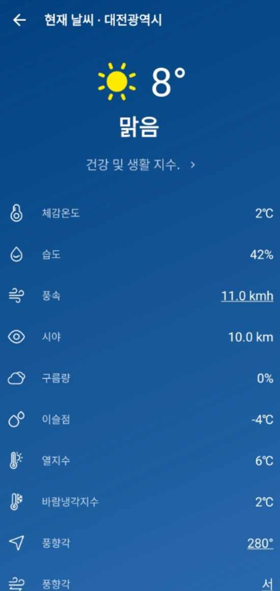 7. '현재 날씨' 상세 화면에서는 지금 이 순간의 날씨에 대한 모든 것을 알려줍니다. 체감온도, 습도, 풍속은 물론 이슬점, 열지수, 바람냉각지수와 같은 전문적인 정보까지 포함되어 있어 날씨에 민감한 분들에게 더욱 유용합니다.