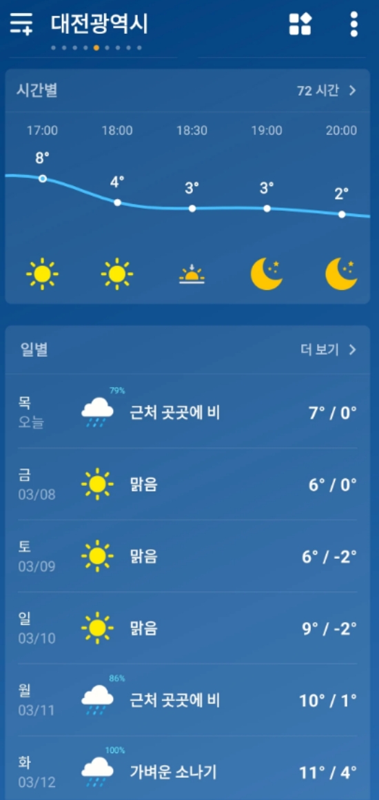 2. 앱을 실행하면 현재 위치의 날씨를 바로 확인할 수 있습니다. 위치 설정을 완료한 뒤 예를 들어 '대전광역시'의 현재 기온이 8도이고 '맑음' 상태라는 것을 직관적인 아이콘과 함께 보여줍니다. 또한, 내일과 모레의 최고/최저 기온도 요약해서 미리 알려줍니다.