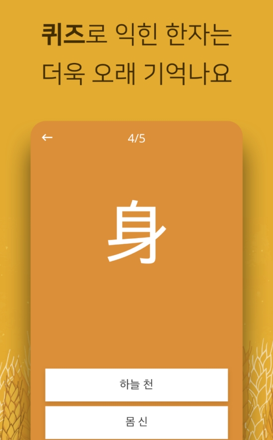 6. 배운 내용을 잘 기억하고 있는지 확인해볼 수 있는 퀴즈 순서도 있습니다. 화면에 나타난 '몸 신(身)' 자를 보고, 여러 보기 중에서 올바른 뜻과 음을 고르는 방식입니다. 이렇게 퀴즈를 풀며 복습하면 학습한 한자를 더욱 확실하고 오래 기억하는 데 효과적입니다.
